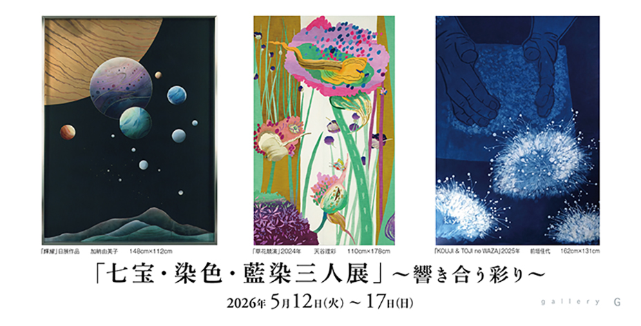 現代工芸美術家協会に所属し、「宙 そら」をテーマに美しい七宝の世界を魅せてくれる加納由美子、ちょっぴりサイケでメルヘンな天谷理彩、伝統的手法で醸し出すJAPAN BLUE(藍染)の前垣佳代の作品展です。